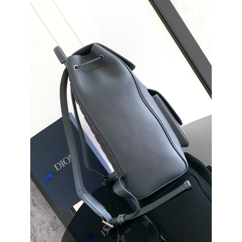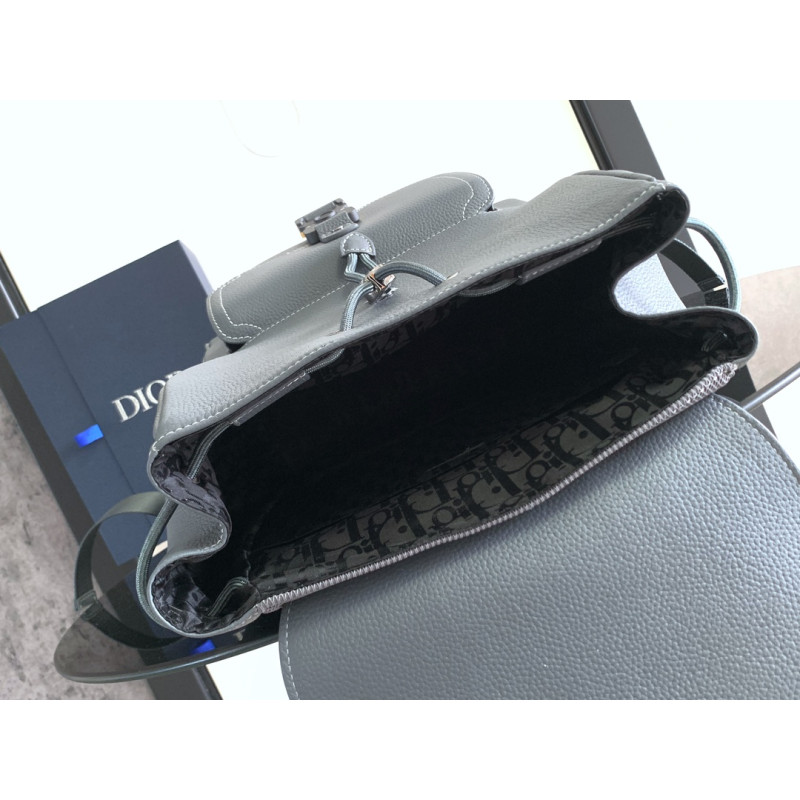 DetailThis saddle flap backpack features a stylish original design that highlights the signature saddle silhouette. Crafted from deep gray grained calfskin with contrasting topstitching, it is adorned with a Dior signature on the front. The spacious interior includes a main compartment for storing daily essentials, while the front saddle flap pocket with an aluminum buckle offers convenient access to items such as a wallet, keys, earbuds, or phone.
