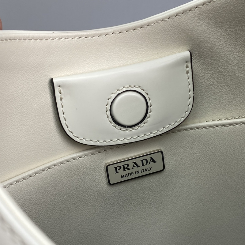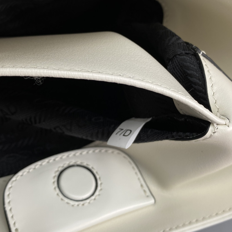 DetailThe special beveled structure of the bottom and sides of this flap bag emphasizes the smooth curved lines and gives it a sophisticated appeal, while the extended handles make it even more functional, allowing it to be worn as a shoulder bag or a tote. Brushed leather, unique to the Prada collection, is a modern, color-changing material perfect for new combinations and contrasts. A triangular enameled logo completes the silhouette.