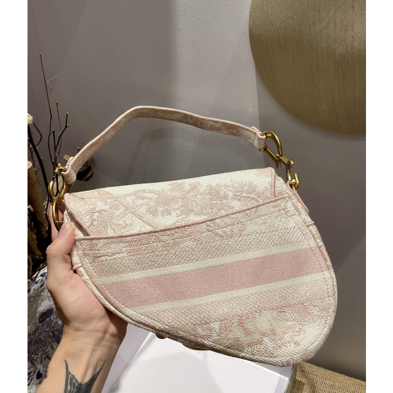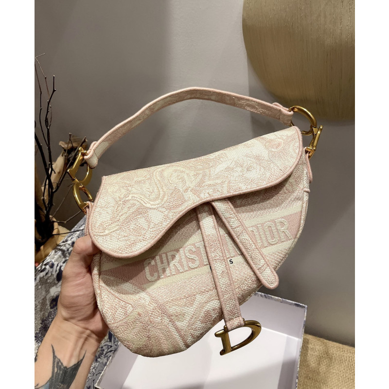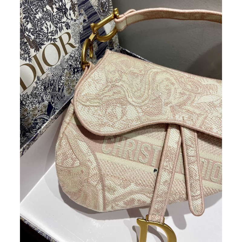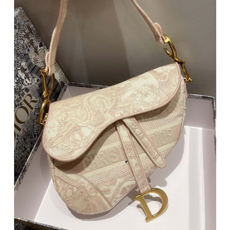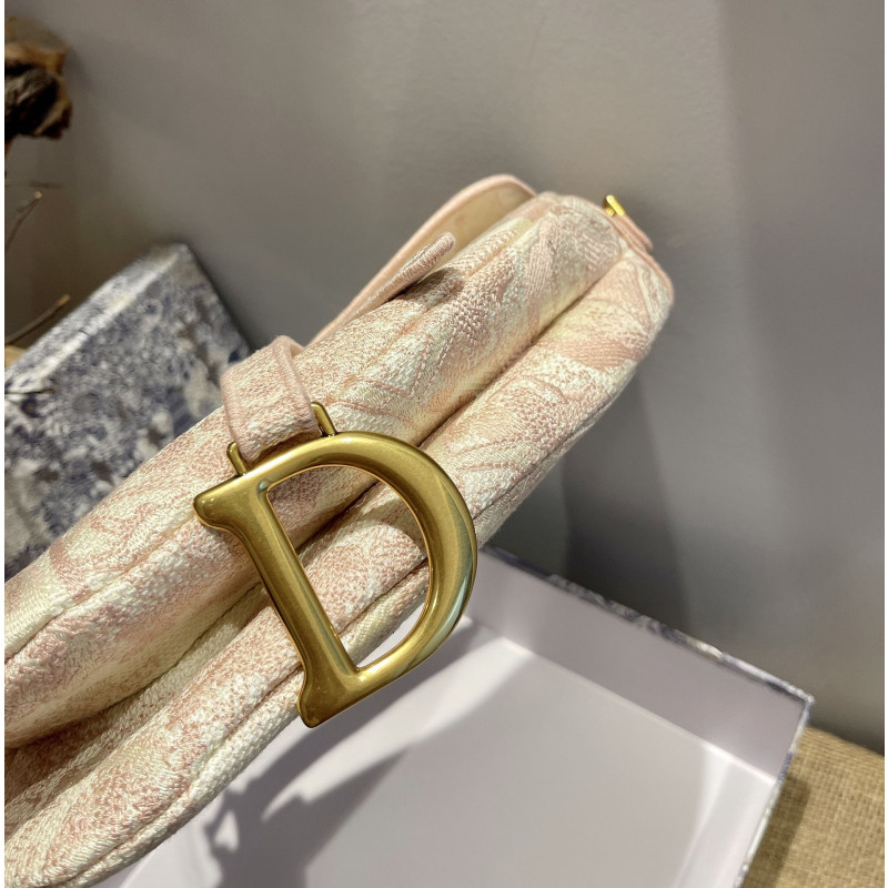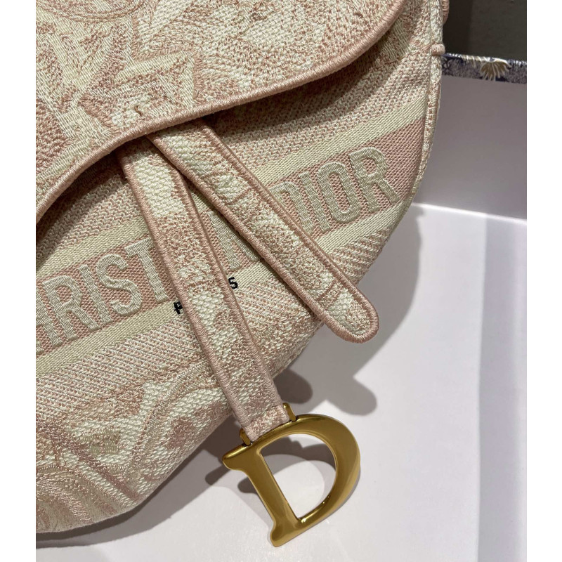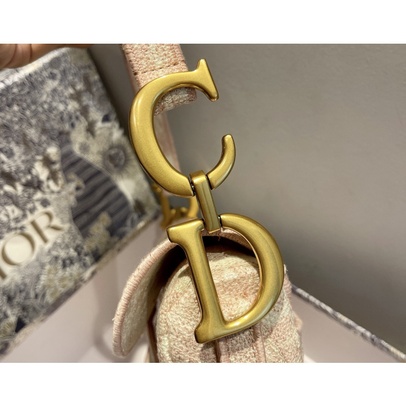 DetailEmbroidered with the Toile de Jouy motif, it reveals a saddle flap with a magnetic D-shaped stirrup clasp, as well as a CD signature in antique gold-finish metal on either side of the shoulder strap. This saddle bag has an adjustable and detachable spaghetti strap and can be carried by hand, over the shoulder or across the body.